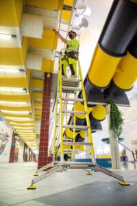 Työtasot ja tikkaat ovat lasikuitua ja eristävät eli ne soveltuvat hyvin myös sähkö- ja automaatiotöihin.